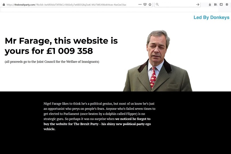 „Nigel Farage lubi myśleć, że jest geniuszem politycznym, ale większość z nas wie, że jest po prostu oportunistą, który żeruje na ludzkich lękach. Nikt, komu nie udało się wygrać wyborów do Parlamentu siedem razy (…) nie jest żadnym strategicznym guru. Może więc nie było zaskoczeniem, kiedy zauważyliśmy, że [Farage] zapomniał kupić strony internetowej dla „The Brexit Party”. (…) Więc my przechwyciliśmy thebrexitparty.com. (…) otrzymaliśmy 8-stronicowy list prawny od jego [Farage’a] prawników korporacyjnych Wedlake Bell, posądzający nas o naruszenia praw autorskich i własności intelektualnej. I wiecie co? Farage używa prawa europejskiego, by nas zaatakować”.