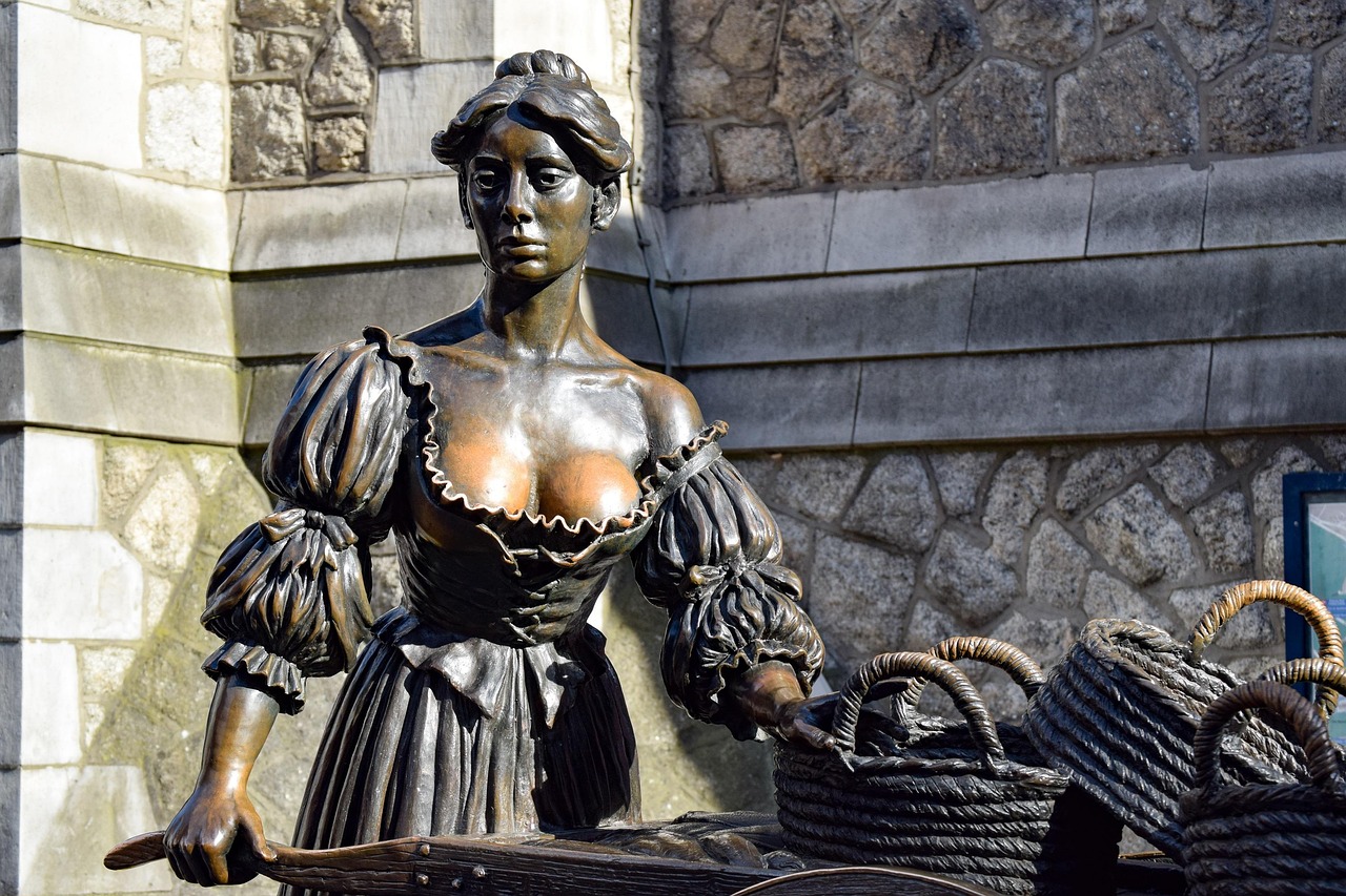 Molly Malone to legendarna postać irlandzkiego folkloru – piękna rybaczka z Dublina, która stała się bohaterką słynnej piosenki “Cockles and Mussels”. W 1988 roku, z okazji Tysiąclecia Miasta Dublina, postawiono jej pomnik z brązu na Suffolk Street. Od tej pory stała się nie tylko ikoną, ale… przedmiotem obsesji turystów.
