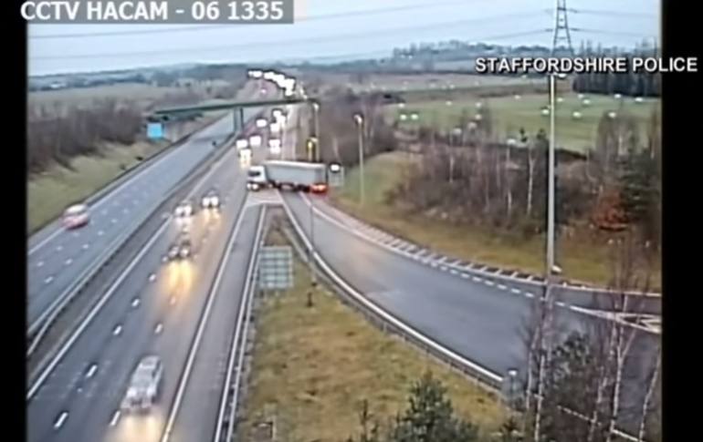 Nagranie ze śmiertelnie niebezpiecznego manewru kierowcy na autostradzie M6 opublikowali w internecie ku przestrodze funkcjonariusze Staffordshire Police. Na wideo widać, jak kierowca (prawdopodobnie, z uwagi na popełniony błąd, nie-Brytyjczyk) zjeżdża na autostradę w złym miejscu i jak stara się szybko naprawić swój błąd. Kierowca ustawia więc najpierw ciężarówkę na poboczu, a następnie stara się zawrócić pojazd stając w poprzek zjazdu z autostrady. Po kilku sekundach kierowcy udaje się na tyle obrócić ciężarówkę, że ta, mimo pędzących po M6 samochodów, włącza się do ruchu po dobrym pasie.