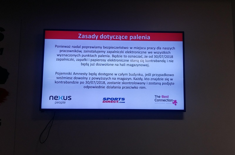 Pracownicy firm mogą czuć się pokrzywdzeni tym zakazem, ponieważ zgodnie z zasadami panującymi w tej firmie przysługuje im jedna przerwa trwająca pół godziny w przypadku 7,5 godzinnej zmiany oraz dwie przerwy w przypadku zmiany 11 godzinnej. Nasz czytelnik zauważa, że wyjście z magazynu na papierosa wiąże się z przeszukaniem przez ochronę, co trwa 15 minut. Jednak najbardziej pokrzywdzeni mogą się czuć palacze palący e-papierosy, ponieważ zostają oni zmuszeni do palenia zwykłych i bardziej niezdrowych papierosów.