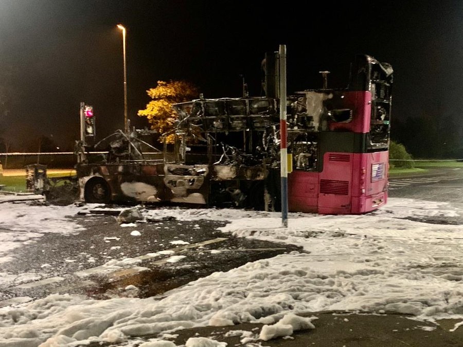 Irlande du Nord : Un bus aurait détourné avant d'être incendié à Newtownabbey. La police indique que 4 suspects ont ordonné à un chauffeur de bus et aux passagers de descendre du bus avant de détourner le véhicule et d'y mettre le feu. pic.twitter.com/JLlJEgeL8F