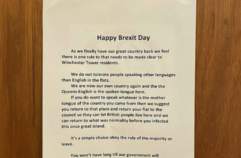 Ta notatka wywieszona na drzwiach bloku Winchester Tower w Norwich wprawiła w osłupienie nie tylko samych jego mieszkańców, ale też internautów w całej Wielkiej Brytanii. W notatce, zatytułowanej „Happy Brexit Day”, ktoś wyraźnie nakazał imigrantom rozmawianie od teraz, odkąd Brytyjczycy ponownie odzyskali swój kraj, wyłącznie w języku angielskim. W razie niezastosowania się do tej reguły, imigranci powinni szybko opuścić znajdujące się w bloku mieszkania socjalne i zwolnić je dla gorzej sytuowanych rodzin brytyjskich.