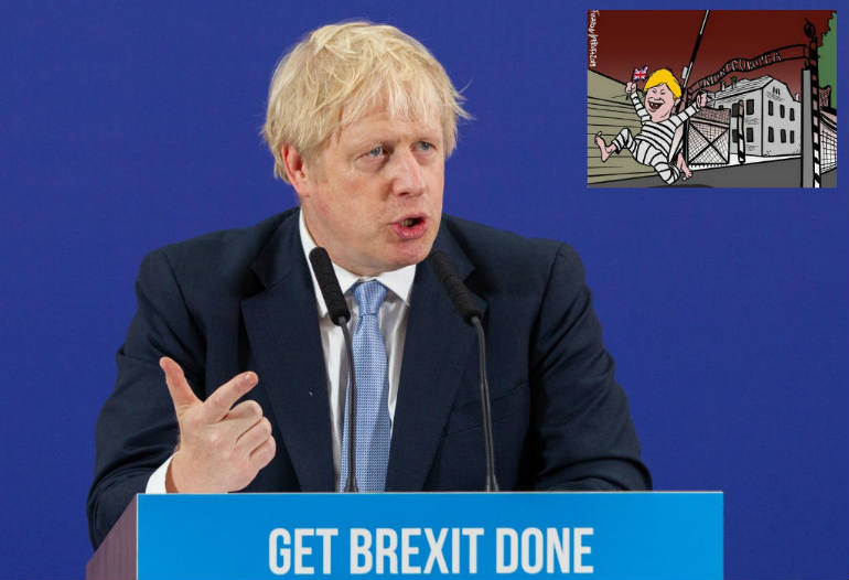Nie inaczej stało się w przypadku włoskiego rysownika Mario Improty, który 14 grudnia (dzień po oficjalnym ogłoszeniu wyniku wyborów w UK) umieścił w poście na Twitterze obrazek, na którym Unię Europejską przyrównał do obozu zagłady Auschwitz (niem. Konzentrationslager Auschwitz), a Borisa Johnsona do uciekającego z obozu więźnia, odzianego w pasiak i trzymającego w ręku flagę Union Jack. Napis „Unia Europejska” pojawił się na rysunku nad bramą wejściową do obozu, czyli dokładnie tam, gdzie oryginalnie widnieje napis „Arbeit macht frei” („Praca czyni wolnym”).