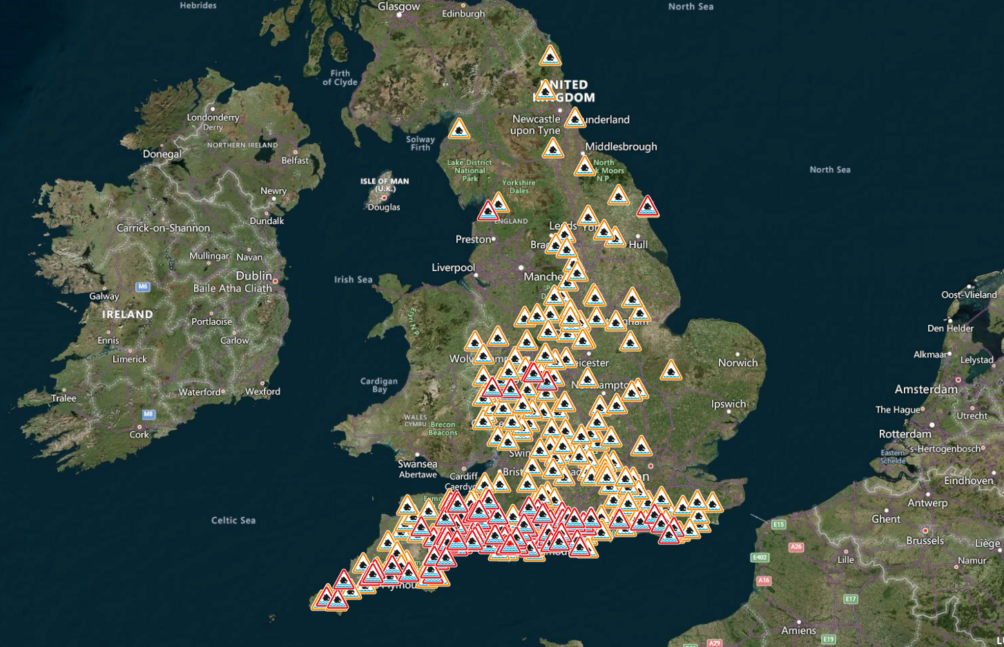 A30 (Devon): Trasa została zamknięta w obu kierunkach między węzłami B3174/B3180 (w pobliżu Ottery St Mary) a B3184 (dojazd do lotniska w Exeter). Problemy występują również na odcinku w okolicach Honiton.