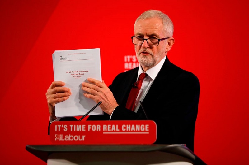 Podczas specjalnej konferencji prasowej w Londynie Corbyn ujawnił, że wszedł w posiadane liczącego sobie 451 stron dokumentu, pełnego "niezredagowanych" przez rząd informacji dotyczących rozmów na linii Londyn-Waszyngton odnośnie NHS. Lider laburzystów twierdzi, że podczas spotkań premiera Borisa Johnsona z prezydentem Donaldem Trumpem odnośnie przyszłych relacji handlowych między USA, a Wielką Brytanią kwestia prywatyzacji brytyjskiej służby zdrowia miała "pojawić się na stole", a więc jako potencjalny element "transakcji" między obiema krajami.