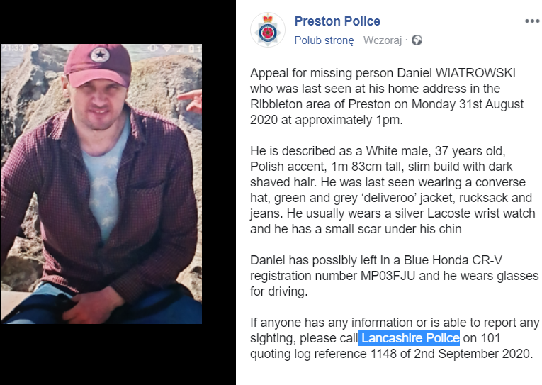 Czy możecie pomóc w odnalezieniu naszego rodaka? Jeśli macie jakiekolwiek informacje na temat pobytu Daniela lub jeśli gdziekolwiek go widzieliście prosimy o zgłoszenie się do Preston Police. Wystarczy zadzwonić pod numer 101, zgłosić się do Lancashire Police i podać numer referencyjny tej sprawi – 1148 z 2 września 2020.