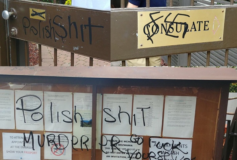Zdjęcia polskiej ambasady w Izraelu wykonane po ataku wandali opublikowała na Twitterze dziennikarka "Haaretz" Noga Tarnopolsky. Widać na nich wyraźnie antypolskie hasła namazane czarnym markerem – "Polish shit" (z angielskiego "Polskie gów…") i "Murderer go fuck yourselves" ("Mordercy idźcie się piepr…"). Z kolei na furtce ambasady z tabliczką informacyjną narysowano (dość nieudolnie, dodajmy) swastykę.